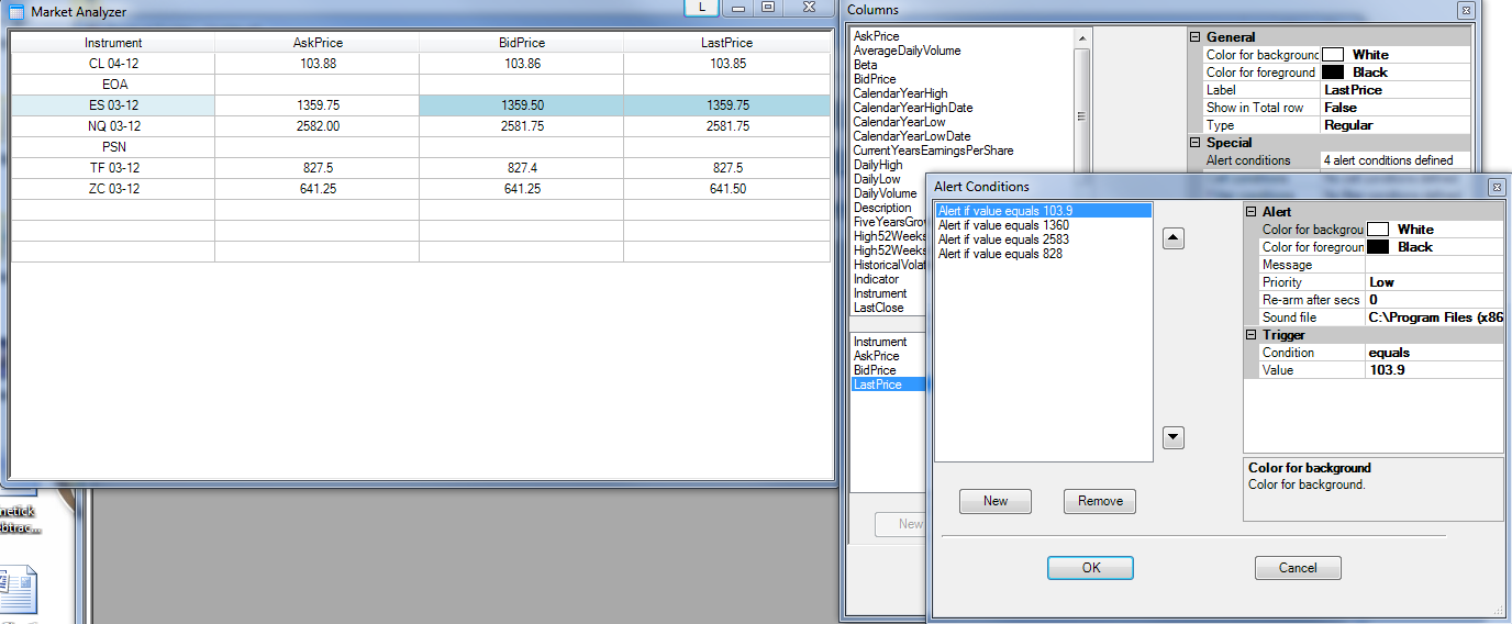 Again, I have 10 stocks in the Market Analyzer window. I followed your instructions and set an alert for "last price". If a try to set another alert for "last price" by clicking on "New" I can not because it is "dimmed out".