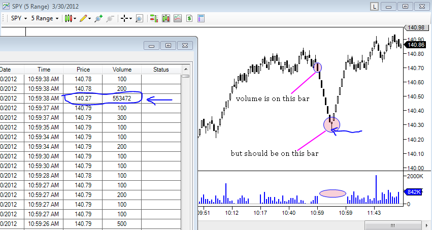 The screenshot shows an example of the issue if the description above is not clear. Let me know if there's any other information you need. As you can see in my example, the misplaced volume can be sizeable, so people that track volume by price on range bars would appreciate it if this were addressed.