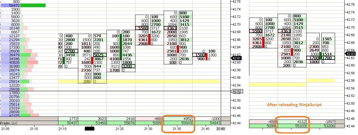 I have a 5min footprint chart of a stock. I watch the Delta value. Whenever a new bar begins I look at the value of the bar before. Then I reload ninja script. After reloading ninja script the value of the bar before is different.