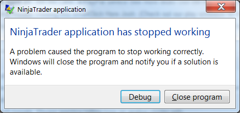 Most of the time I get a windows error that says the "Ninjatrader application has stopped working" (see attached image). When I check the trace files then it has the following: