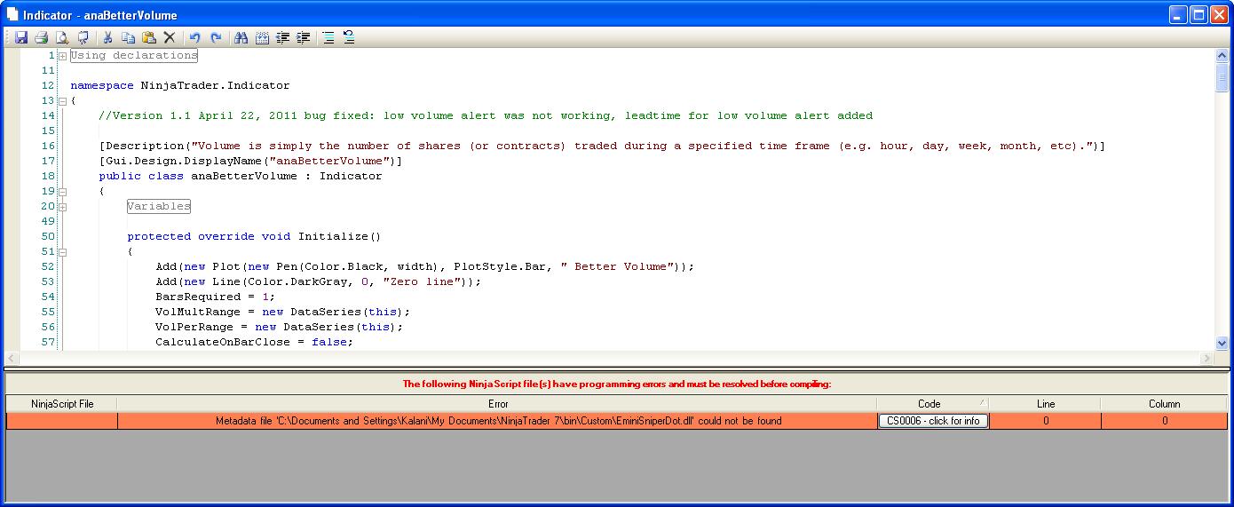 If you are unsure as to what the error is indicating, please send me a screenshot of the error with the name and description fields clearly readable to support[at]ninjatrader[dot]com with "ATTN: Patrick" in the subject line and a reference to this thread in the body of the e-mail: http://www.ninjatrader.com/support/f...ad.php?t=49469