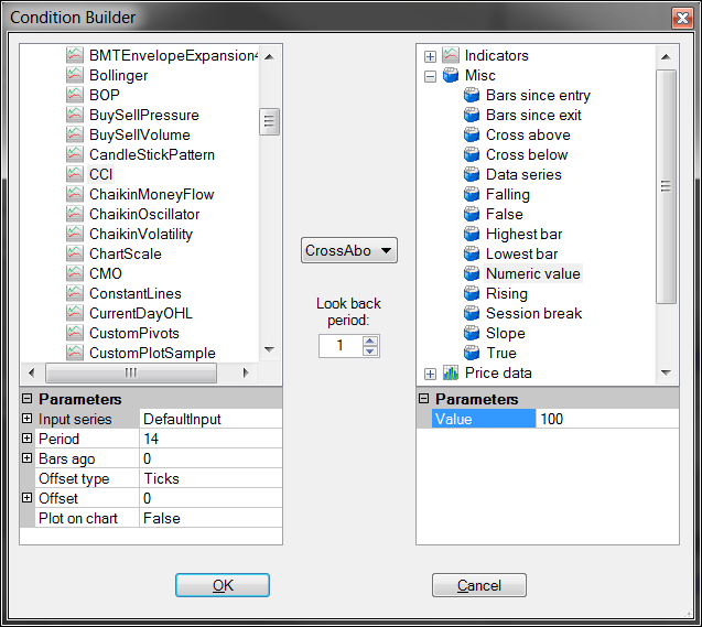 My strategy requires triggering trades off of the CCI signal line crossing the +100 and -100 lines (and others) of the CCI indicator. I'm working in Strategy Wizard but can't conceptualize how to do it. I can see how it would work on the chart but having trouble translating it to the Strategy Wizard (If it can be done in Strategy Wizard and not Ninjascript). The parameters don't include the +- 100 lines and don't understand what would serve as the signal line. Close of bar? Sorry, need some remedial help to get going. Thanks.