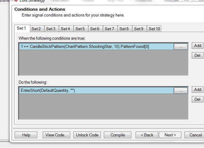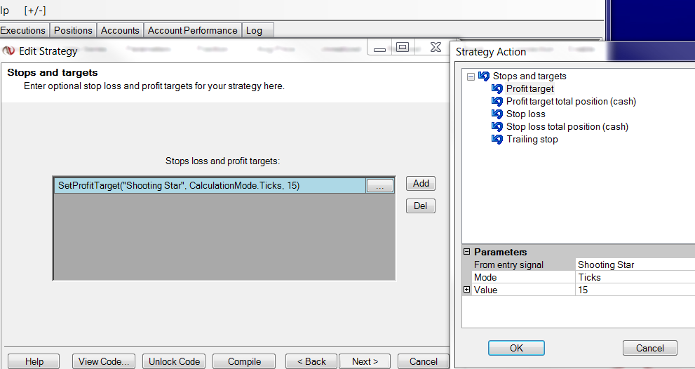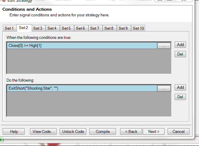 Also I want to exit short if any bar close above high of shooting star or hit target (15 ticks). But my Exit Short Condition and Target Condition didn't do as I wanted. Screenshots enclosed.
