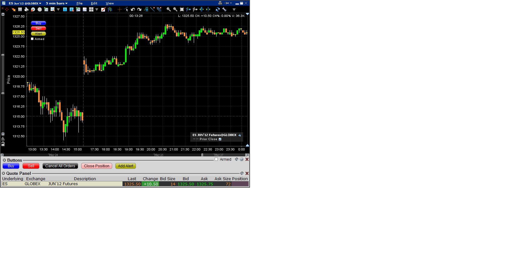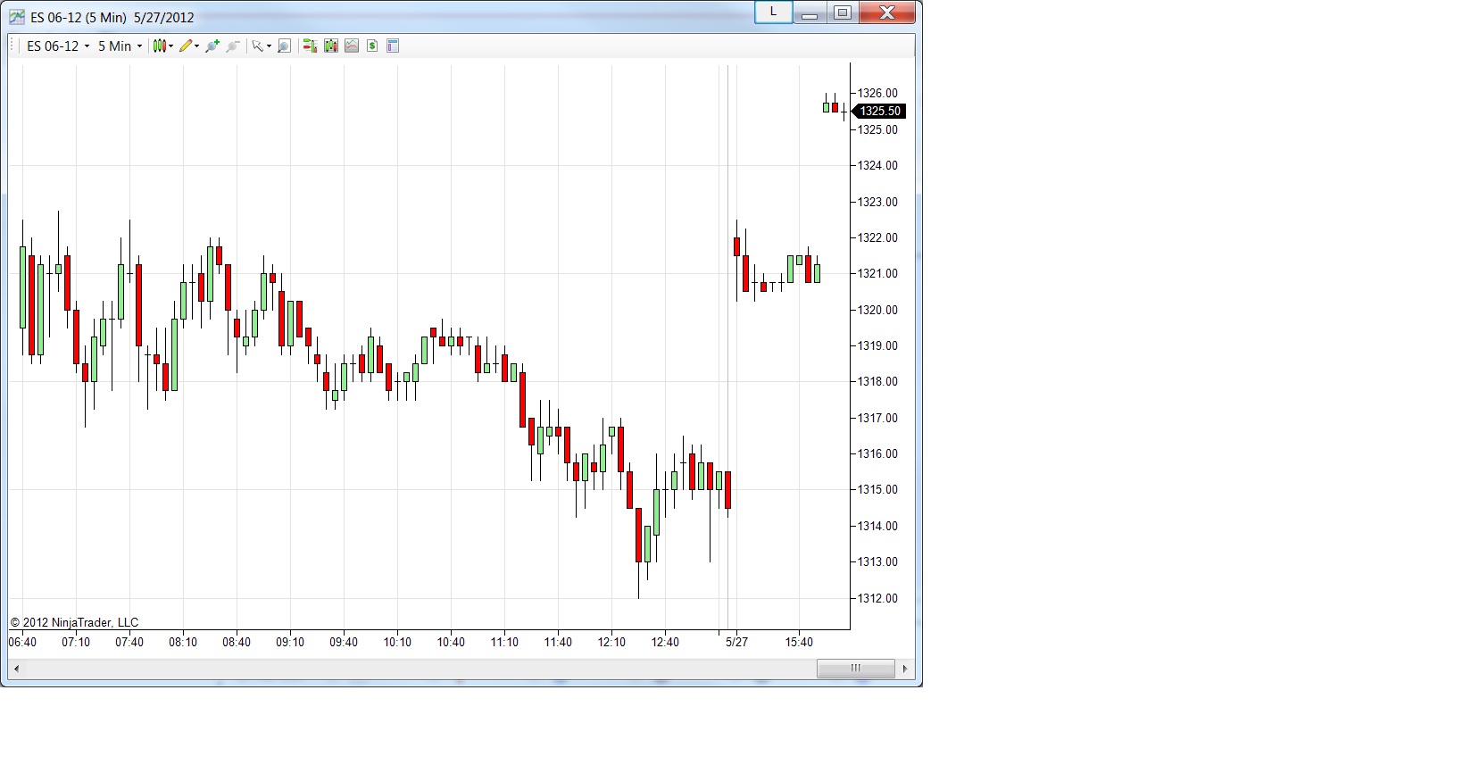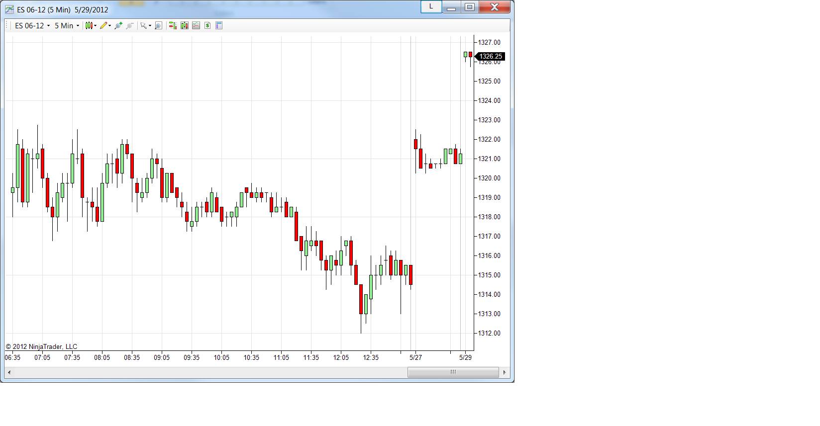 No, I was not talking about the gap between 5/25 and 5/27. I was talking about the gap between price 1321 and 1325 in the Sunday May 27 session in the NT 5 minute chart. The chart was attached in the first attachment. I attached the native IB chart for the same instrument and same time period. The real data has no gaps between 1321 and 1325 this afternoon.