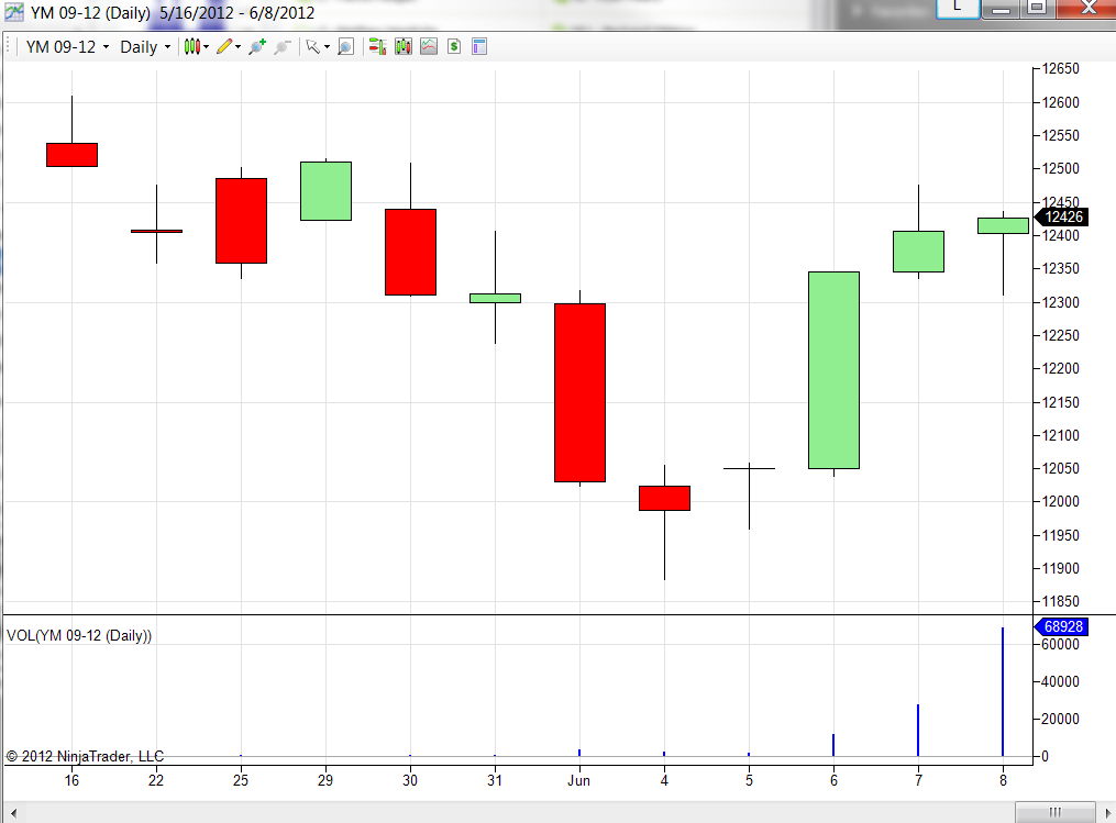 I was preparing last night to switch my workspace to YM 9-12, when I saw something REALLY bizarre! The YM 9-12 volume was at least 80% LOWER on 6/7/12 than on 6/6/12. I went into Historical Data Mgr, and deleted the 6/7/12 data for a) minute, b) tick; and let the charts reload. After the charts reloaded, there was no change to the YM 9-12 chart data for 6-7-12.
