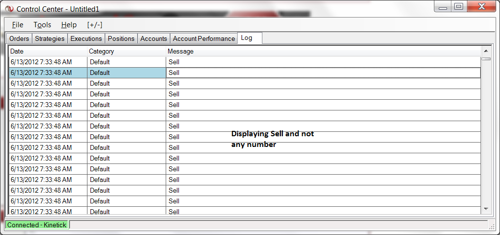 The log tab is displaying the Buy/Sell etc messages and not any number. This is true for the Alert box also.