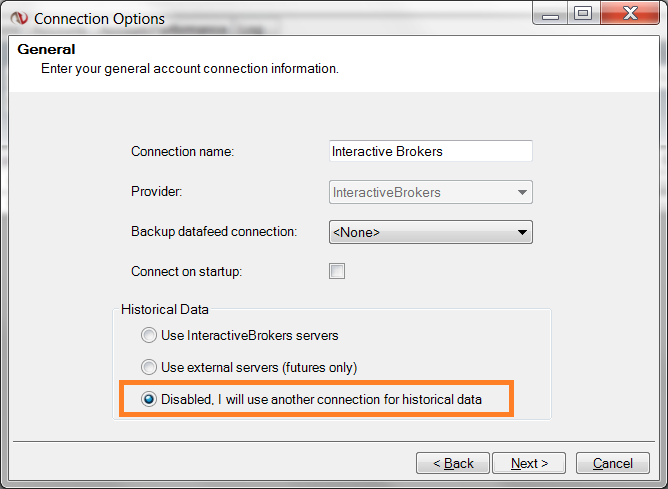 • In the General window please select the Historical Data option as "Disabled, I will use another connection as historical data"