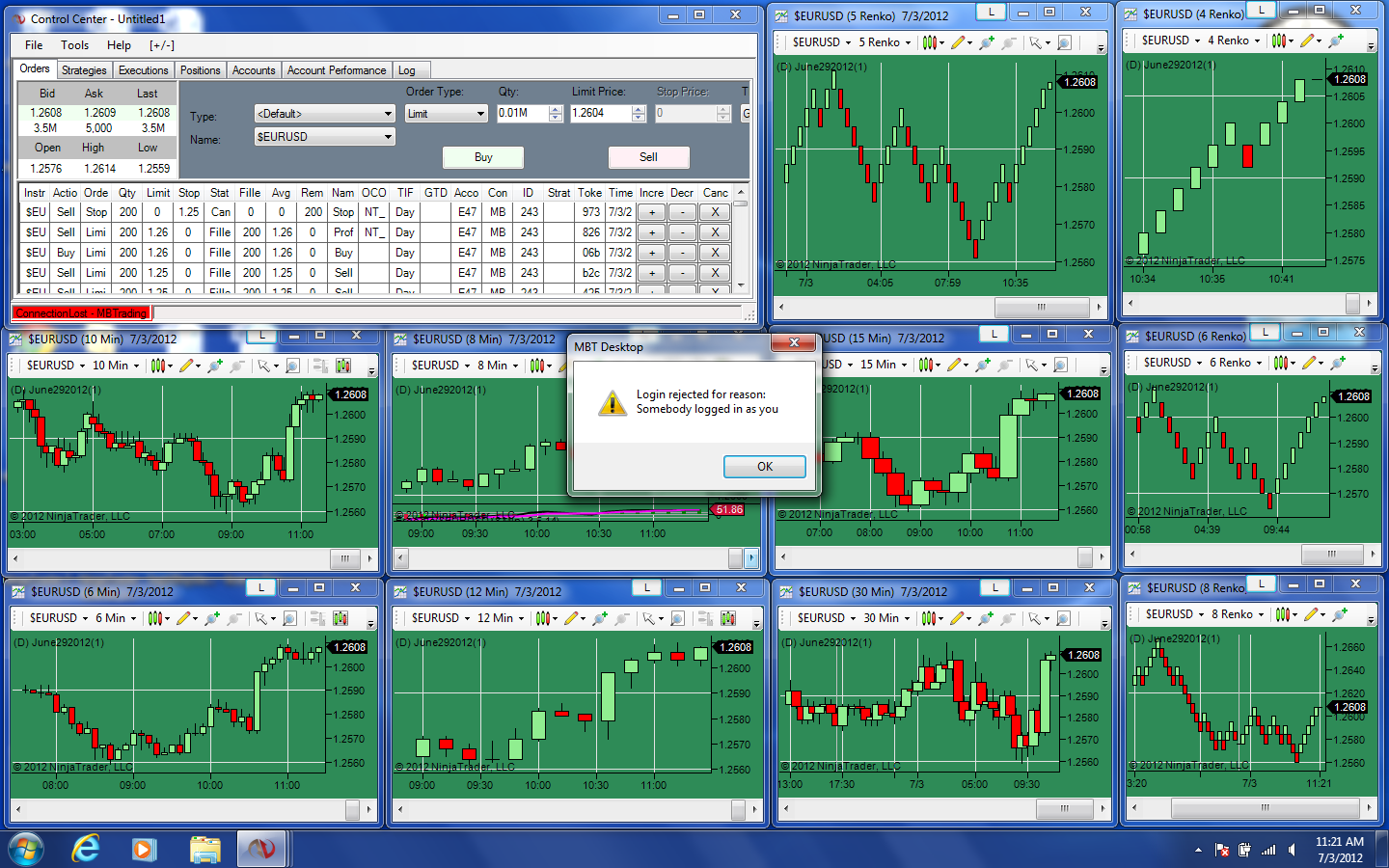 I am having all kinds of trouble that I think may be related to my broker??? Now, every time I try to log in, it says Login rejected because somebody logged in as me? When I finally get connected, soon, it kicks me out and says the same thing???? I use this system ONLY for Ninja so can't imagine someone could have hacked me???? Any ideas????Tags: None