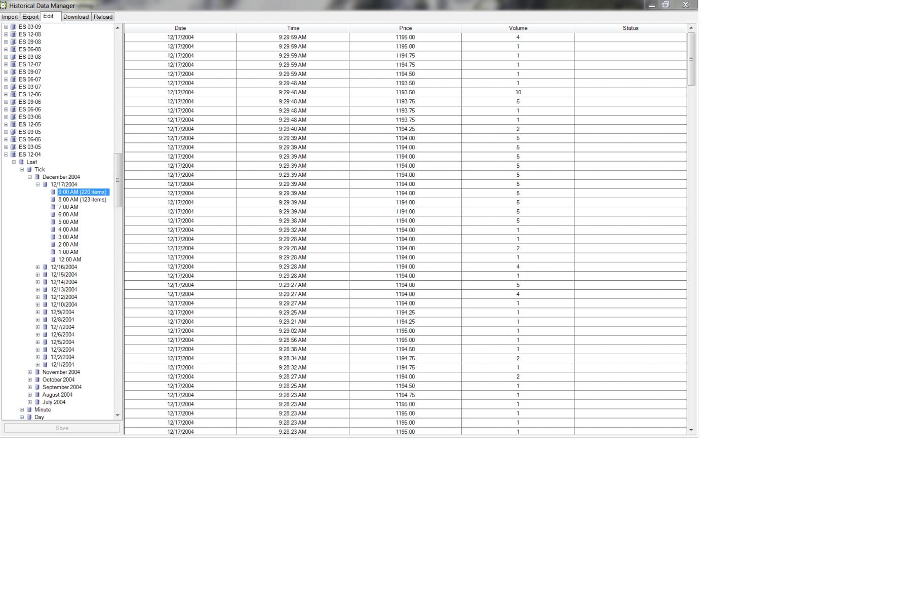 I've downloaded ES data from TickWrite by contract expiration date. They've been renamed to correspond with NT's naming convention (i.e. ES 12-04.txt for December 2004).