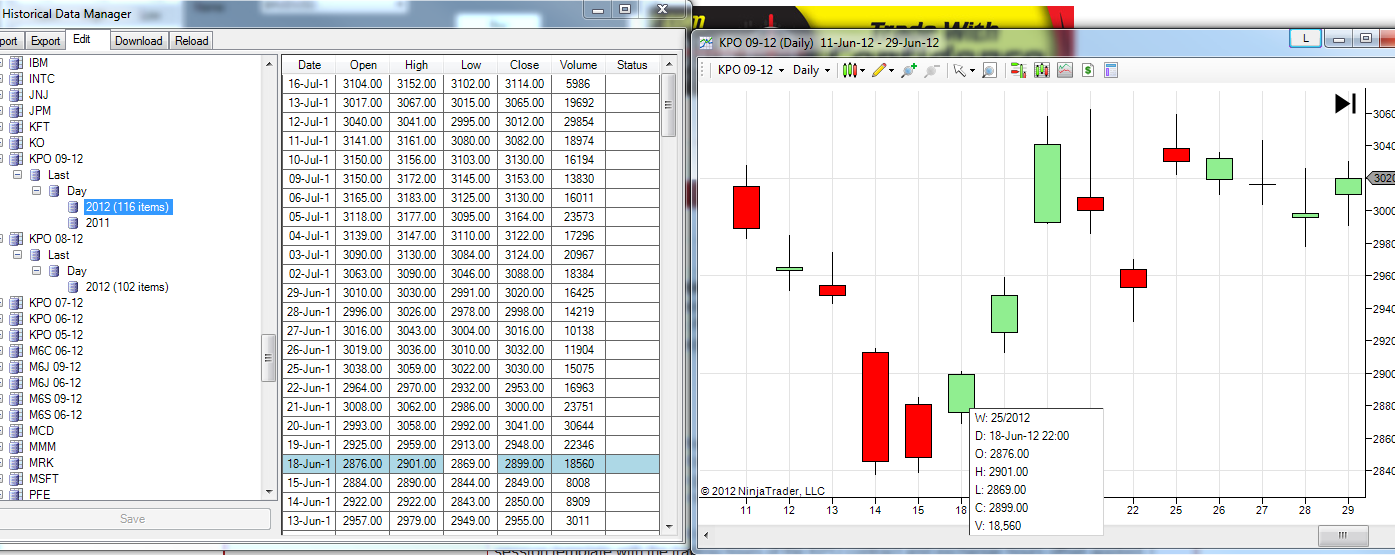 Before I shutdown NT I reload the KPO 09-12 chart to see if it appears differently, then I check the Historical Data and found 2 months of data missing. This is under MergeBackAdjusted policy.