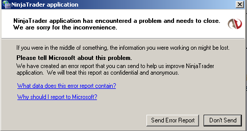 Everytime NT starts it asks for my serial, no problem, then it loads and gives a window telling me about the NT YouTube site, no problem.. click OK then NT crashes and I get a message saying that "ninjatrader has encountered a problem and needs to close" bla bla bla.