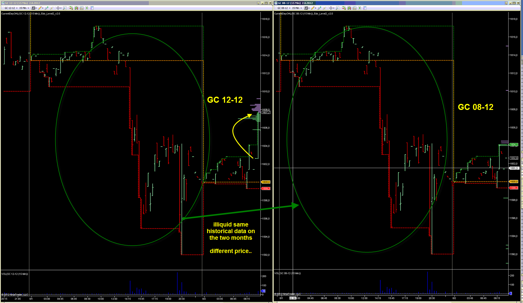 When I open both of them, so while I have the current price GC12 GC-12 and 08-12, but historical data is downloaded from the datafeed GC 08-12