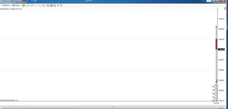 Hello everyone. I am just getting familiar with NT and it looks like a solid product. I am having an issue though with a chart type. I am trying to follow someone elses instruction and he uses the 2000 tick chart with NT. The problem is that after selecting a new chart and using the ES 9/12 and then entering 2000T in the open area, it does change to that cart but shows no information. What I mean is that up top, it indicates that it is displaying the 2000 tick and that is also verified by checking the data series. The problems is that all I see is one vertical candlestick and changes periodically (I assume with the price) but no history to the left of it. The slide on the bottom fills the entire bottom and so nothing is being displayed there for me to grab and move. Last night I don't remember exactly what I did but I saw a few of the trades I made (as they do display on the chart) just under this vertical candlestick. It's as if all of the information is being squished into one vertical line instead of displaying the history. Has anyone heard of this? If I choose the 2 minute, 5 minute, or any other menu item, it works fine.