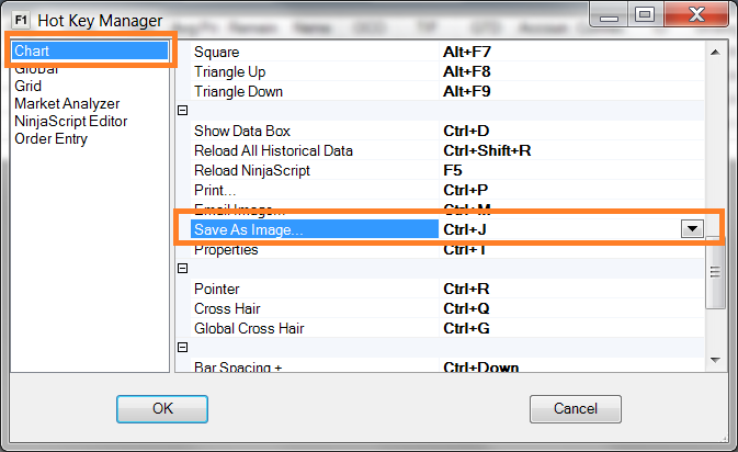 I've been looking around online but can't find anything. Is there a keyboard shortcut for saving a chart image (to avoid right-clicking on the chart)? If you save a lot of these it would be nice to be able to do so quickly (immediately at order entry).