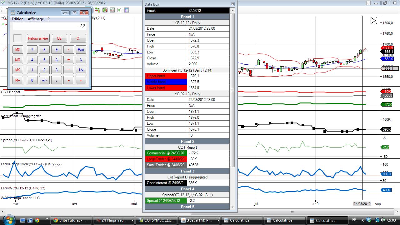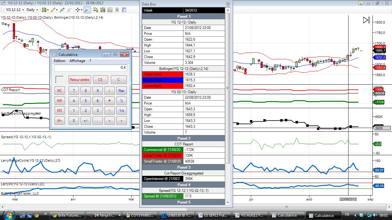 In the first screenshot the primary instrument is 21/08/2012 but the data box displays 22/08/2012 for the secondary instrument (YG 02-13). If the spread indicator calculates the difference of the 2 closing prices it should plot -0.4, however it plots 17.5. In my opinion there must be a mix up with the dates or something. This is confusing.