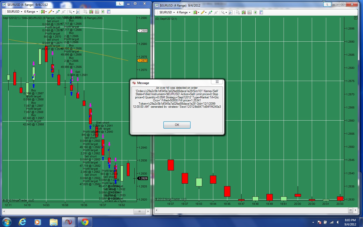 Originally posted by edgeliner View PostI am very frustrated, and I'm not sure where to turn??? I have been programming with Ninjatrader for quite a few years. For the past few months, I can't tell you how many good scalping systems I have created that keep giving me on Over Fill error message and closes the system (see attached). Is it the new version of Ninja or MB Trading? Again, this has not happened for many years until the past few months??? Any ideas???