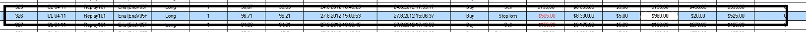 on this CL NT7 reports: 27.8.2012 15:00:53 Entry for 96,71, Exit 27.8.2012 15:06:37 for 96,21. Stoploss set to 50 ticks. Loss -505 (incl comm.).