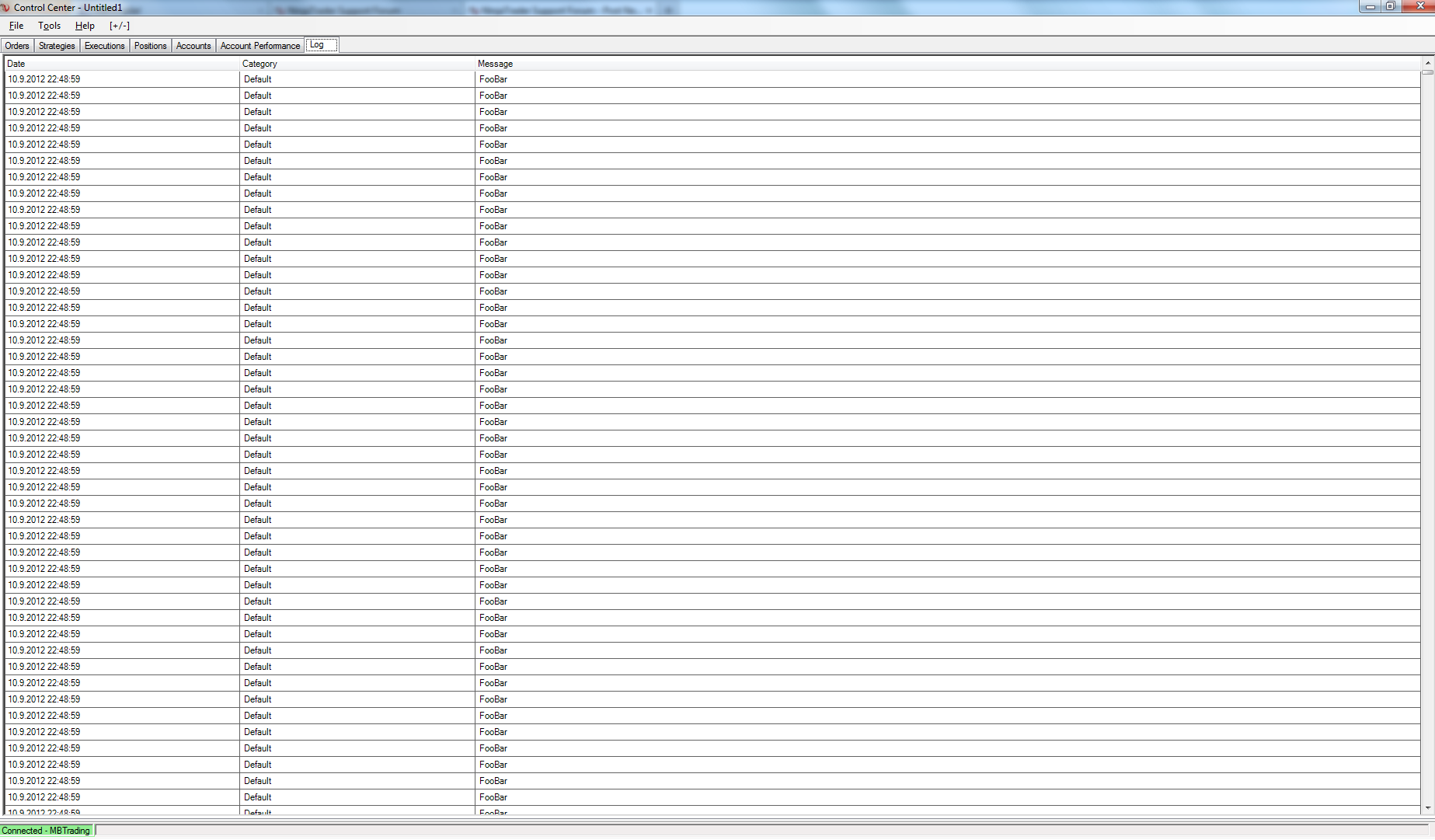 In my case I run it on Sim101 account, the connection is on the MB Trading demo account, instrument ES 09-12. Add this strategy to your Strategy Tab and make it Enable. I would expect to have logged FooBar message only once a minute at realtime run, but I get a tons of FooBar messages logged into my Log Tab (check attachments), so this means that in this case NinjaTrader totally ignore Historical run and says it runs realtime. This violate what documentation says about Historical attribute: