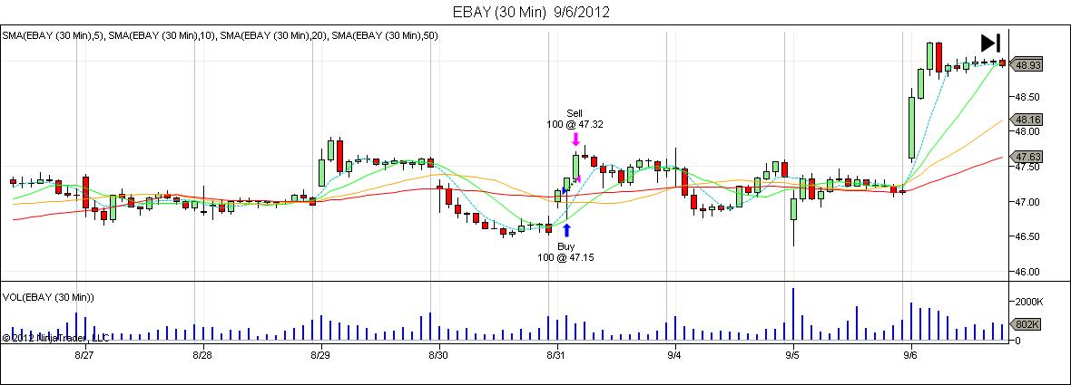 Code:if(CurrentBar<85) { Print("Not enough bars. Current bar count: " + CurrentBar); return; } else { if(Close[0]>SMA(5)[0] && Volume[0]>=(SMA(Volume,10)[1])*2 && Close[0]>(MAX(High,10)[1]) && Slope(SMA(50),11,1)<0 && CrossAbove(SMA(10),SMA(20),20) && CountIf(delegate {return Close[0]>SMA(20)[0];},10)>4 && CountIf(delegate {return (SMA(10)[0]<SMA(20)[0])&&(SMA(20)[0]<SMA(50)[0]);},30)>9) EnterLong(); if(Close[0]<SMA(5)[0]) ExitLong(); }MatthewNinjaTrader Product Management