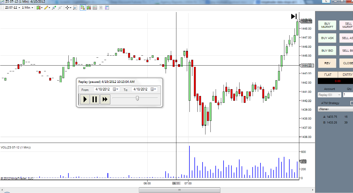 I'm having a problem with missing data in Market Replay using Soybean futures. For some reason the data stops at 5:15 AM PST and then reappears at 7:30 AM PST. I've tried changing the instrument settings to various standards (CME FX, CME Commodities, CBOT agriculturals) and no matter what it won't show the data for that period, which is precisely what I need to see. I've attached a screen shot of the chart to illustrate.Tags: None