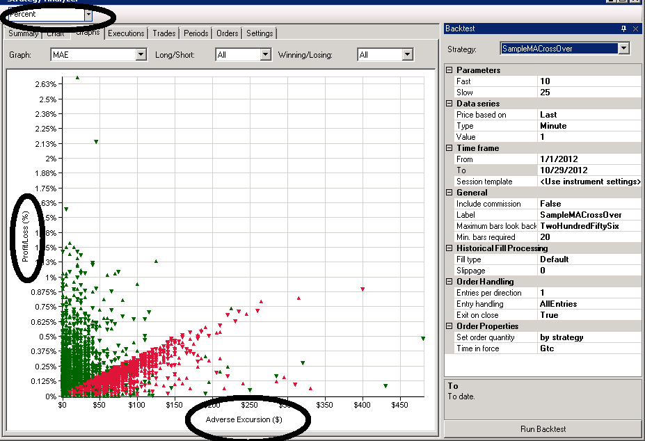 I am trying to generate MAE/MFE graphs in percentage terms for both the resulting P&L and the excursion, using the strategy analyzer.