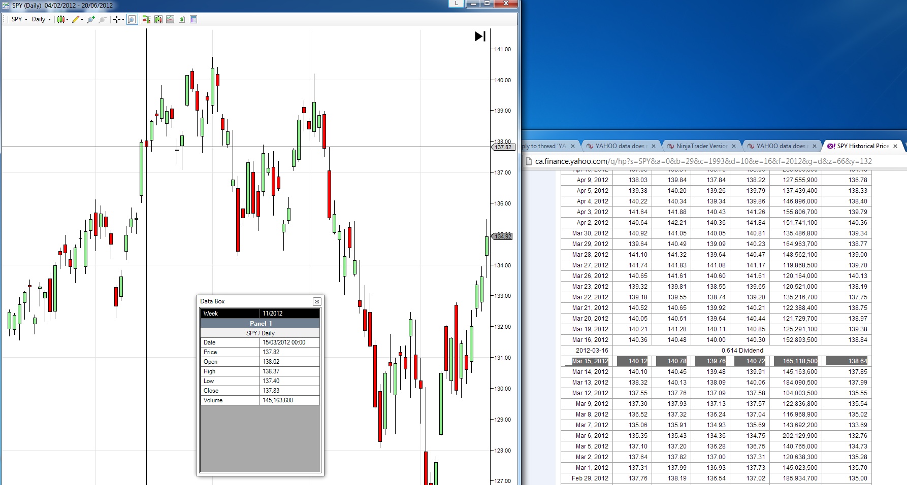 I have downloaded & displayed udjusted ETF data from Yahoo and after some number of bars I am seeing a difference between the udjusted close as displayed on Yahoo and the close given by the chart (ie for SPY, March 15 2012: Yahoo adj. close=138.64 but NT chart adj. close=137.83).