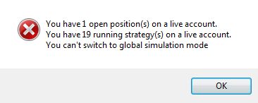 When I try and click Global Simulation Mode. NT reports that I have 19 running strategies on my live account, see attachment.