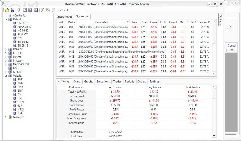 Also, my "Shares in play" is obviously how many shares I want to trade. In the optimizer I set that so it stays at 100 (Min 100, Max 100, Interval 1). However, as you can see in the screen shot, for some reason it turns into 30. Could something be wrong in my strategy code that is letting it do this?