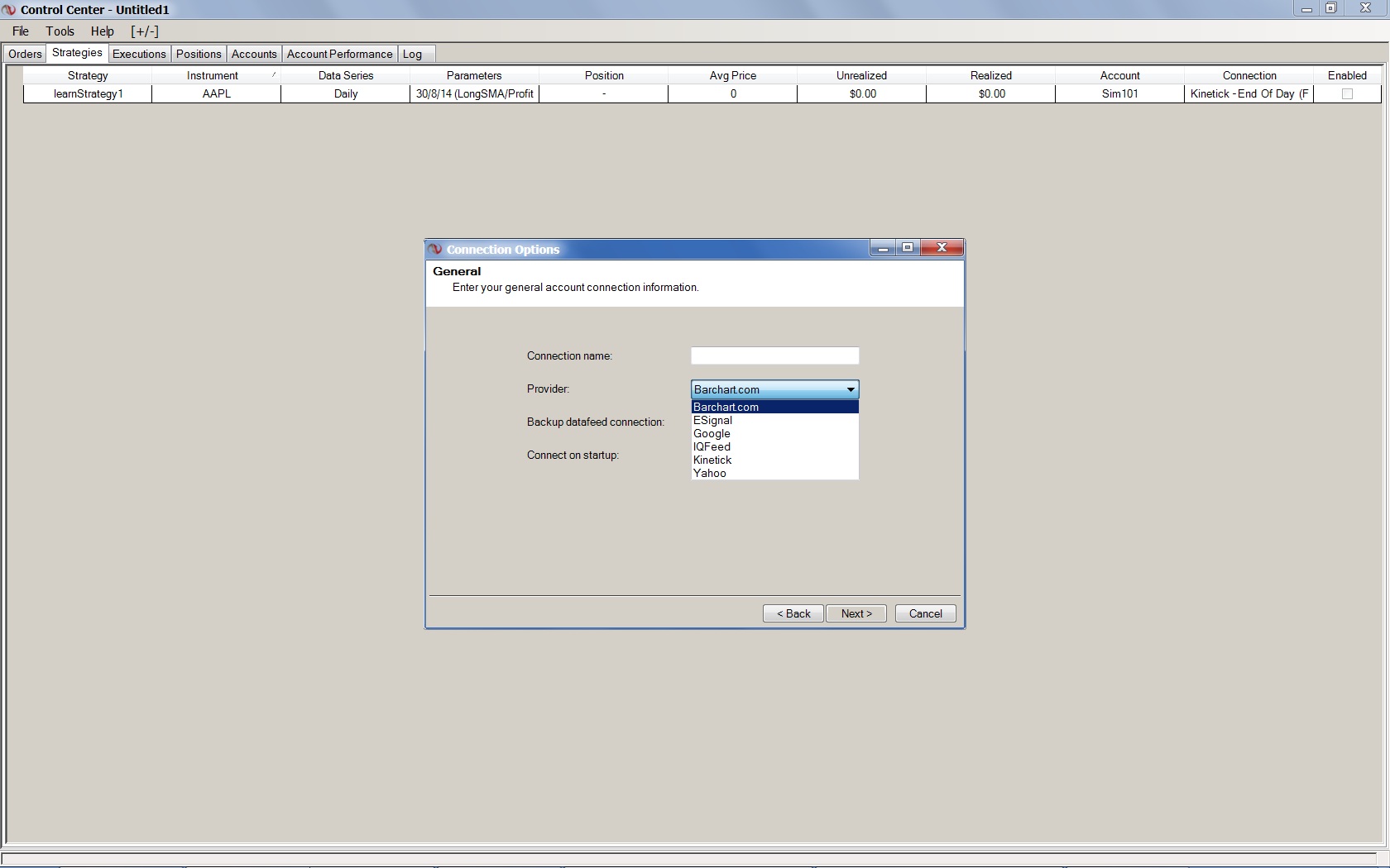 I'm glad to hear that restarting allowed you to access the connection again. Based on your description, NinjaTrader's license key could not be verified on the first attempt - because of this, no connections would be made available.