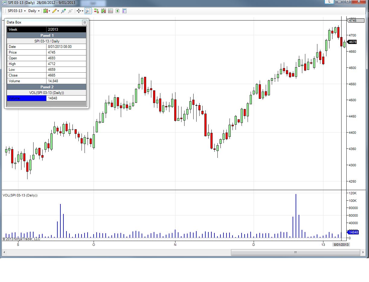 Firstly, the SPI trades in two sessions 9.50am - 430pm Mon to Friday and a night session 5.10pm to 8am the next day. (It is closed from 8.01am Saturday until Monday morning 9.49am)