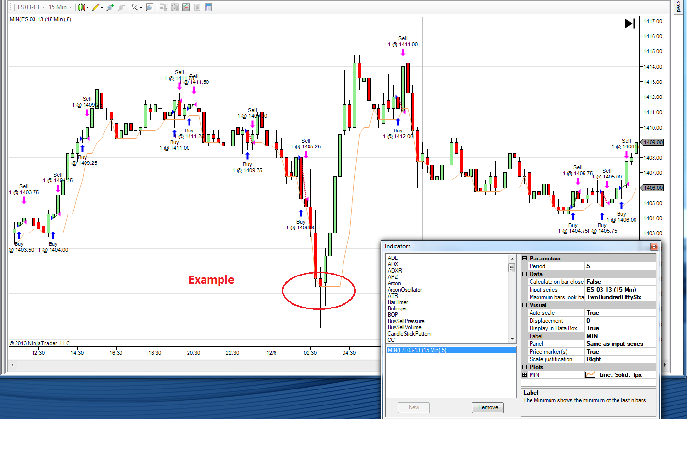 Correct, per default it would use the Close price, you can though specific to use the Low series of the ES instrument in the parameters 'Input Series' section on the right side for the MIN() indicator.