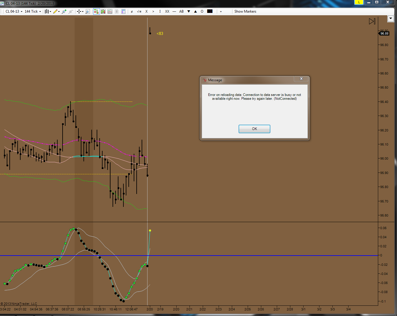 Edit - I have been informed that we have been are running our one of our Backup servers so you could be running into a resource problem from our end. Restarting NinjaTrader should resolve this issue. While, we are on our Backup server you may want to reduce the number of days of data that you are loading to be able to reduce the frequency of getting disconnected to our Data Server.