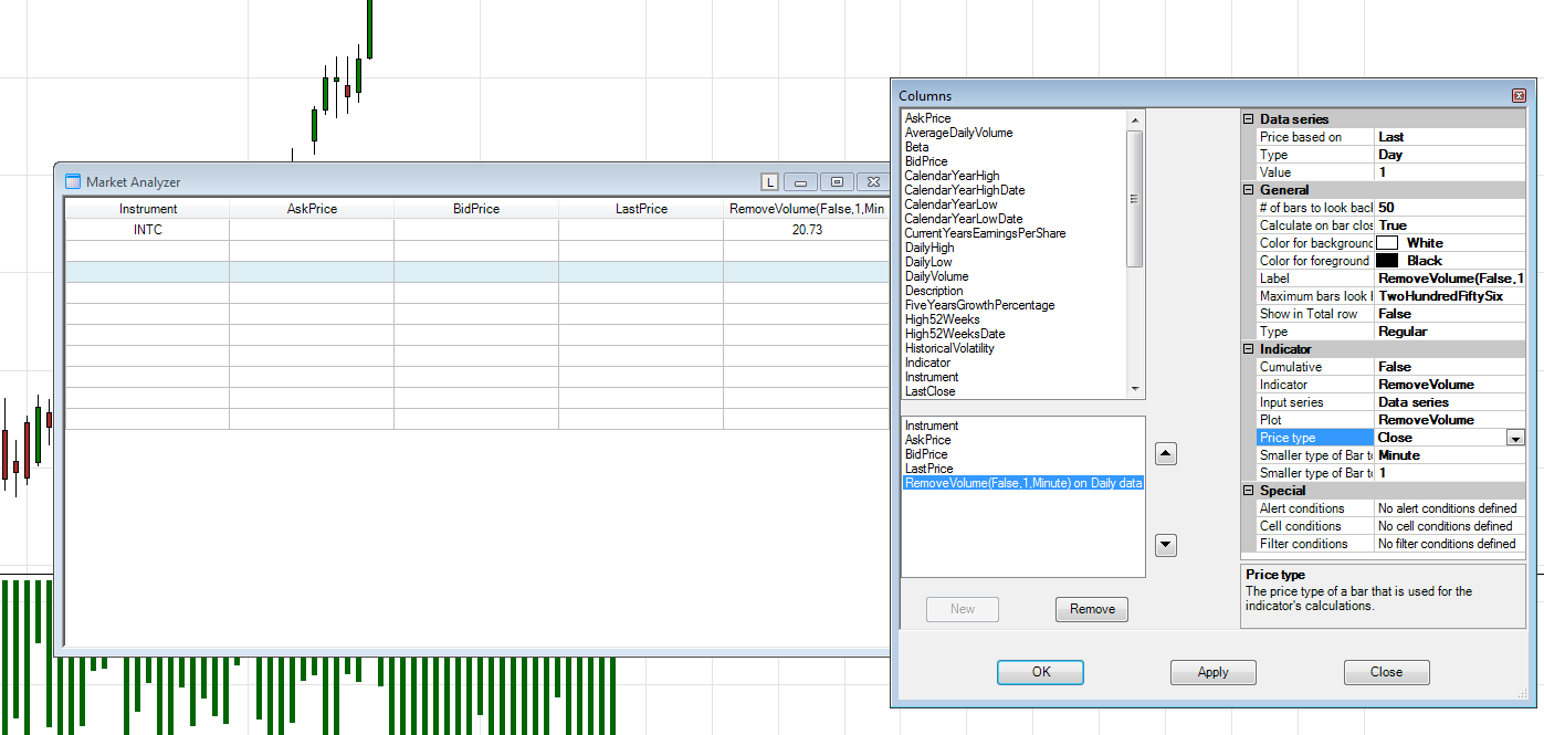 Also, you will want to set the number of bars loading on your Market Analyzer column to the number of days you are loading on your chart for example by default a daily chart is going to be set to 365 days so you would want to then right click inside of the Market Analyzer, select Columns, select your Indicator column, and then since it is a daily chart change the "# of bars to look back" to 365.