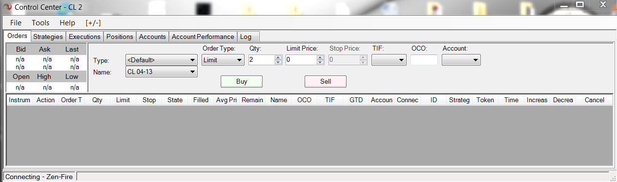 I see that NinjaTrader is trying to connect to your Zen-Fire connection, but is unable to do so. I would like to get some information about your connection, but for your protection, do not want it on the forum. Can you please send a note to support[at]ninjatrader[dot]com with a reference to this thread in your message so we may continue to work through email?