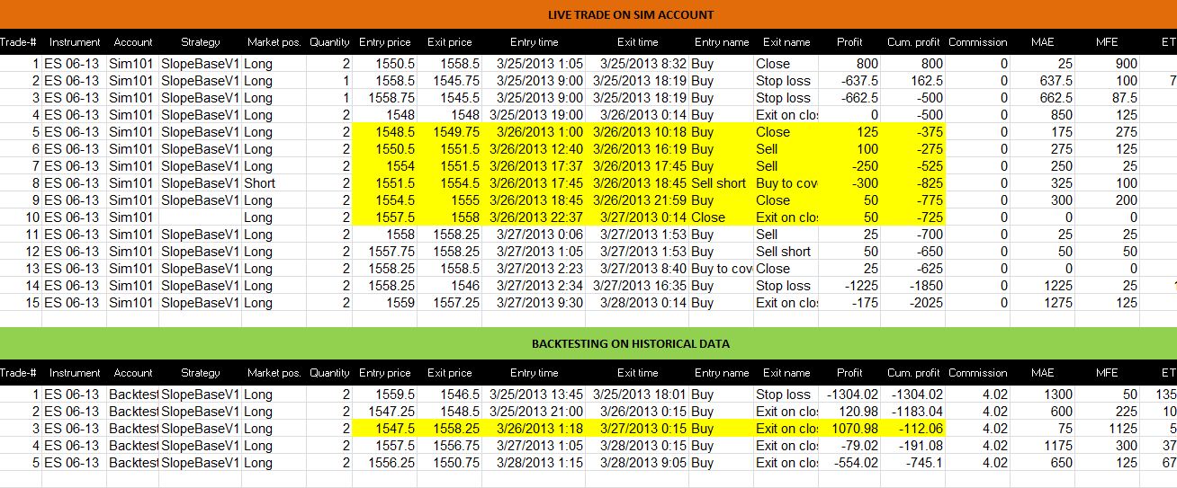 I have found a significant discrepancy between back testing in Strategy Tester and actual auto trading the same strategy on live market on S&P 500 future. At about the same time span of roughly 23 hours, the strategy traded six times on live market with a negative Acc. Profit, but on back testing it only traded once with a large positive profit (see the highlighted cells in the attached file). I have checked all parameters and they are exactly the same. I have seen similar problem with CL and EUR/USD as well. What can be causing this problem and how can I prevent it, because it has created some doubts on the whole back testing performance of NinjaTrader.