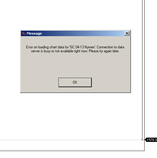 I last connected with (Velocity) Trading Tech last Tues. THis morning, Monday, I opened my ES, CL Gold charts with ES and GC having problems. All daily charts had no historical data but was recording current realtime intraday data onto the daily charts. My 30 min charts for GC 06-13 and ES 06-13 were missing. The message I got for all problems was "connection to dataserver unavailable or busy right now". please see attached. Is that true? For GC, although I changed contracts from 04-13 to 06-13 I still read 04-13 in the error message. For ES 06-13 is same through out.