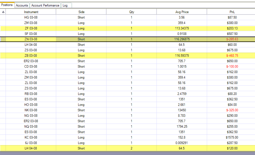 If you look at the attached file, its showing me in all the bond markets that got screwed up yesterday, Dierk you said they would all be gone today but they are still there, its showing me in lean hogs when Im flat, I have no idea why 5 years are still showing. its somehow not reading the PATS stuff. The broker and PATS and my manual audit are all correct, the position screen in ninja is wrong. Ive been in conference with them, they say their end is fine.