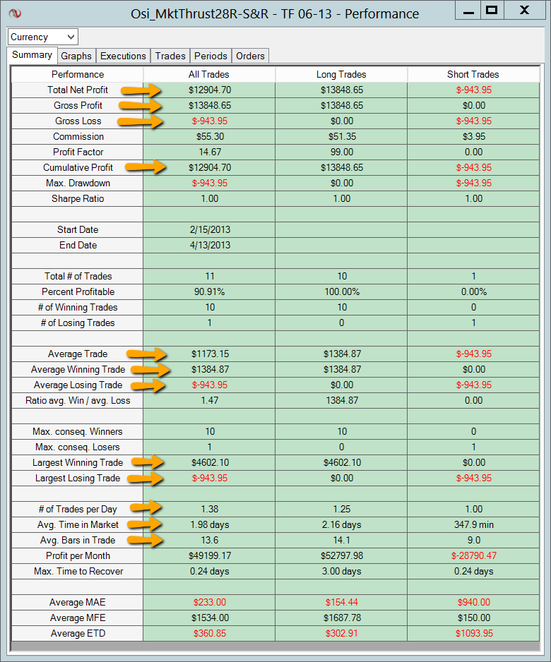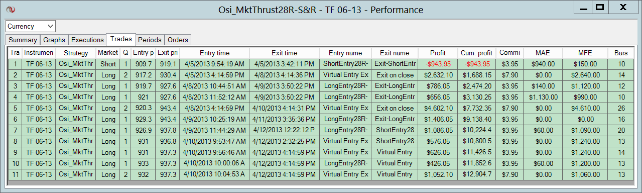 1) Picture of stategy trades on chart. (Realtime trades start on 4/5/2013; earlier trades are theoretical, historical trades, per the strategy setup).