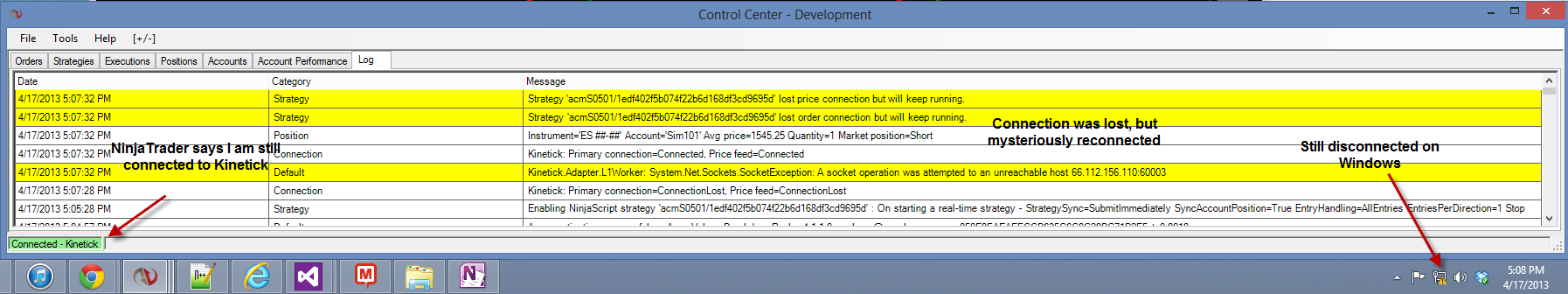 4. NT almost immediately says it has reconnected to Kinetick, even though I have not put the plug back in.