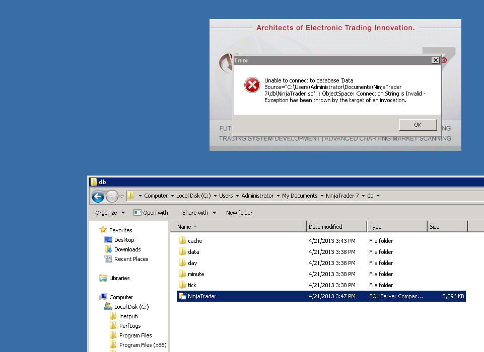 Unable to connect to database'..NinjaTrader.sdf':ObjectSpaceConnection String is invalid"