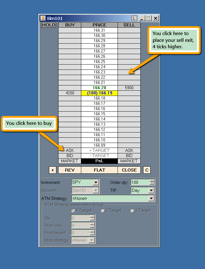 You do exactly the same thing using the DOM.Originally posted by zenfireuser View Posti am new to ninjatrader platform and I am coming from thinkorswim. i've tried watching all the youtube videos but I am still confused about bid/ask. this is my plan for thinkorswim and I would like to use the same plan for ninjatrader. for /es futures, if i want to buy while it's going up, I click on ask and buy at market. then i hit the bid and i click it 4 ticks up. so basically when the bars go up 4 ticks, I make my money. how on earth do i do that on ninjatrader? it has buy market, sell market, buy bid, buy ask, sell bid, sell ask..i'm so confused I just want to do a simple trade. anybody help me here?