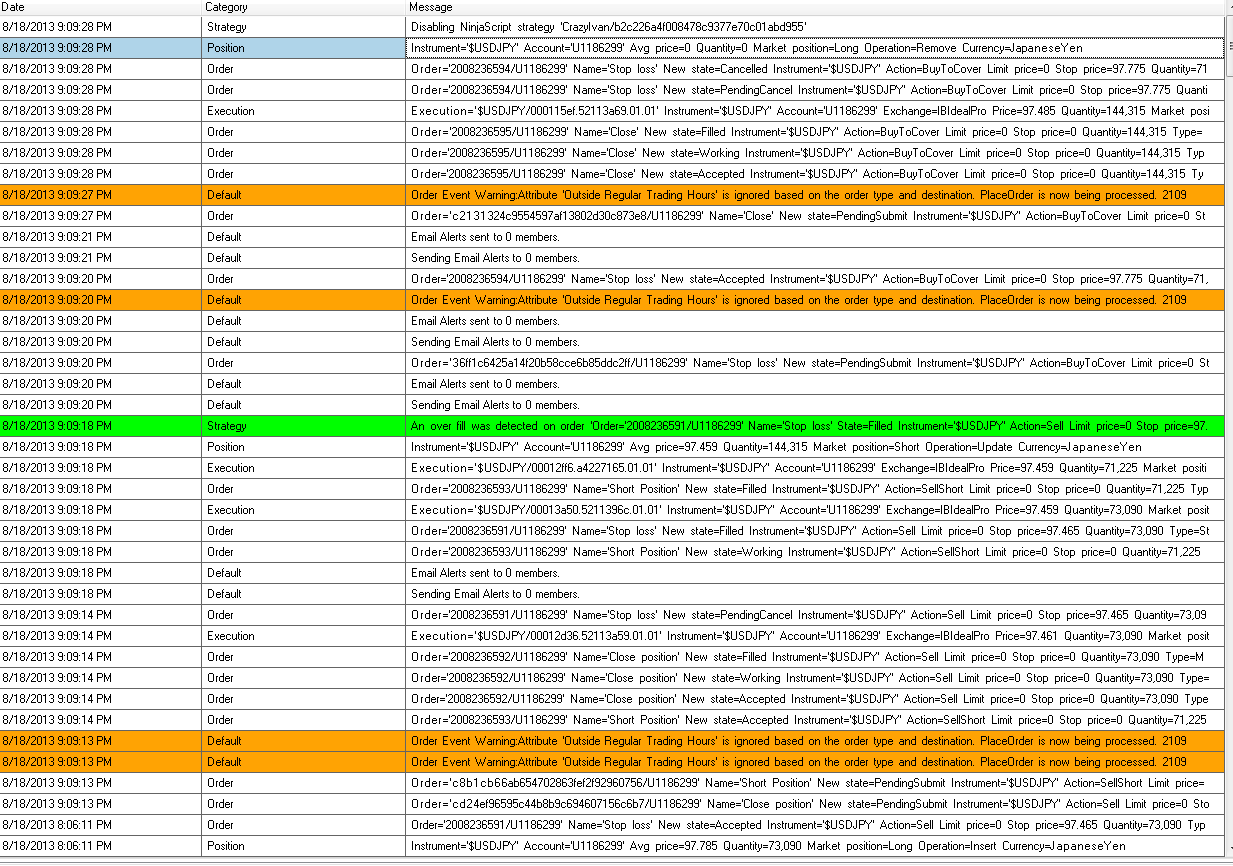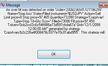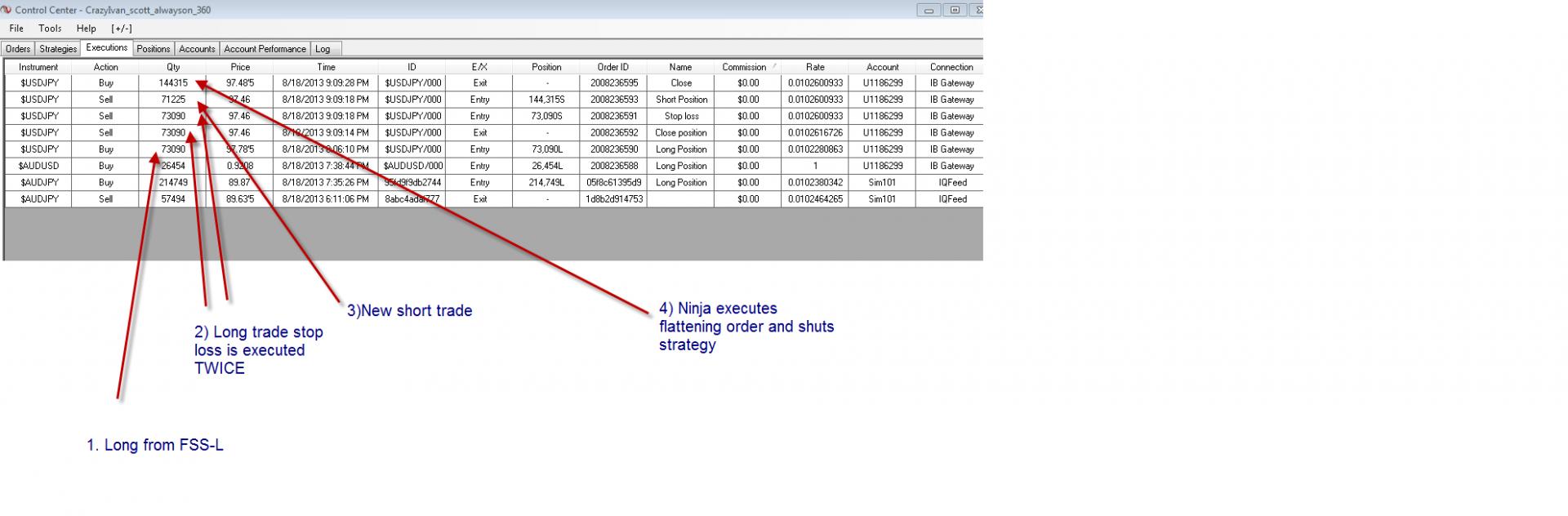 This stop was executed twice (see attached screen captures) and then Ninjatrader executed a flattening order and shut the strategy down with the error "An overfill was detected on order xxxxxxx"