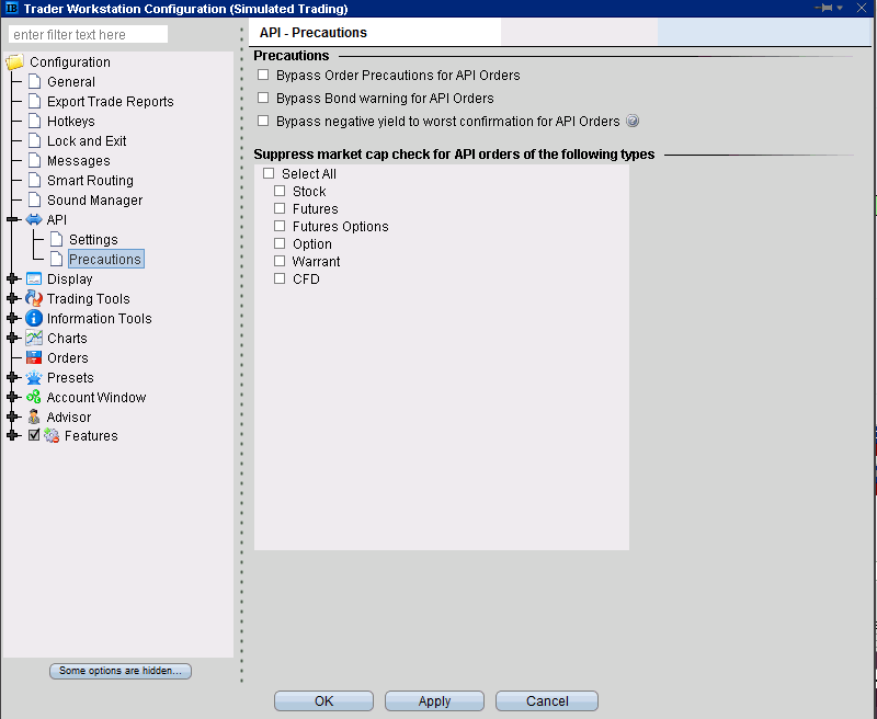 Correct, but for those the facevalue of the product would be checked, for your 2 ES contracts that is over the 100K set (as per the screenshot you shared). For the API you can also check to bypass those precautions completely, please see the first option in your latest screenshot of the IB config page.