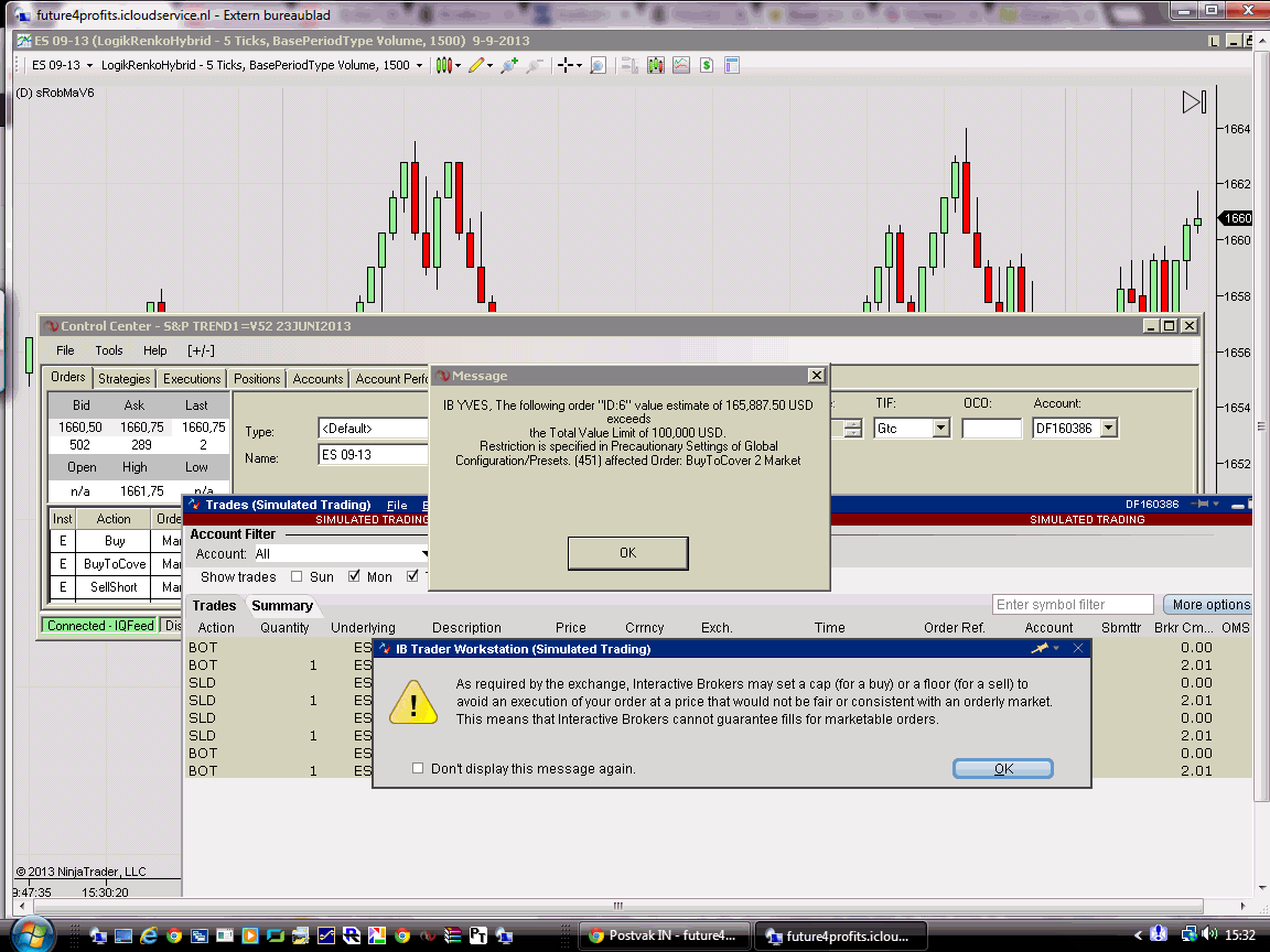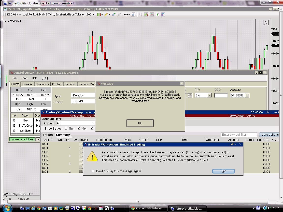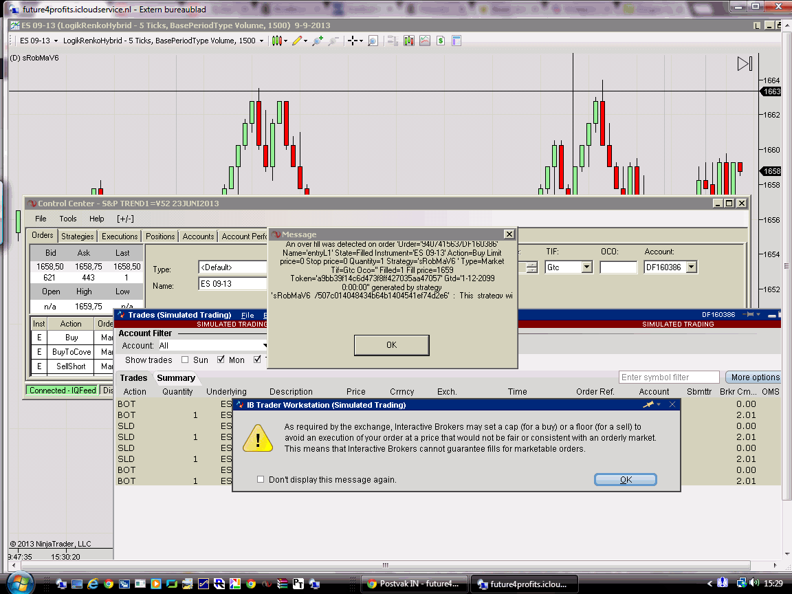 A single entry causes no problem, but an exit and entry at the same time (roundturn) causes a lot of troubles: automatically disabling the strategy in NT and various popup warnings of NT as well as TWS (see attachments).