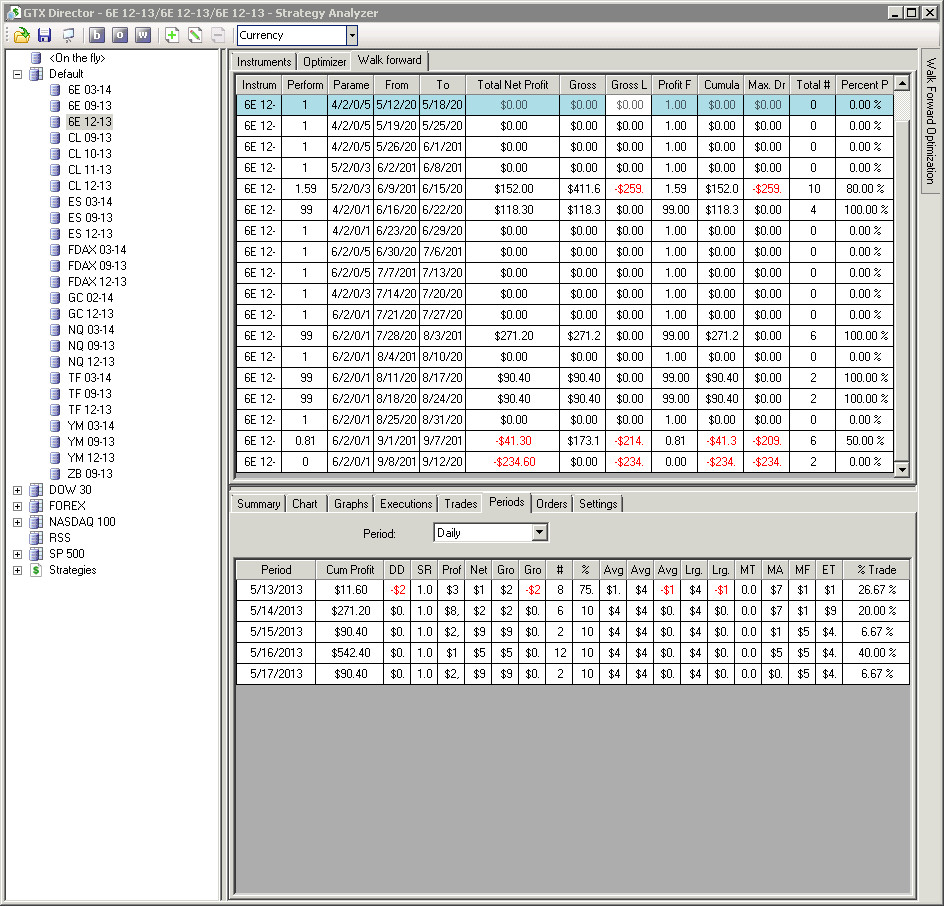 The results window shows $0 cum profit for many of the periods but not all. When I click on a period with supposedly no trades, the lower screen shows trades and some have profits and some have losses.