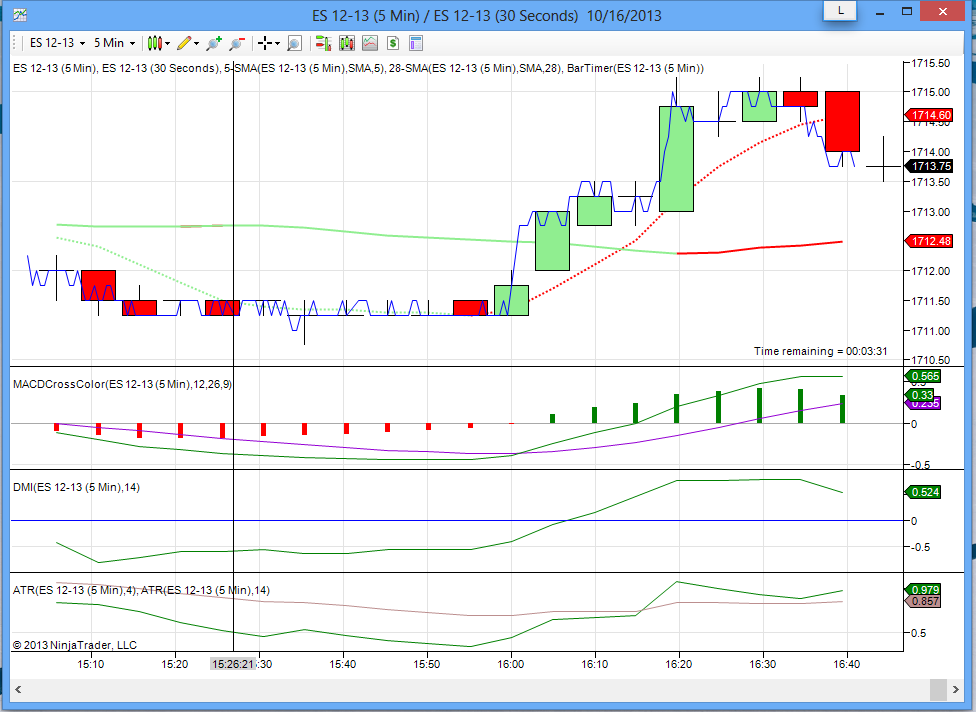 I have a 5 min and a 30 sec timeframe charts positioned on the same panel, where the 30 sec chart is setup as "line on closing".