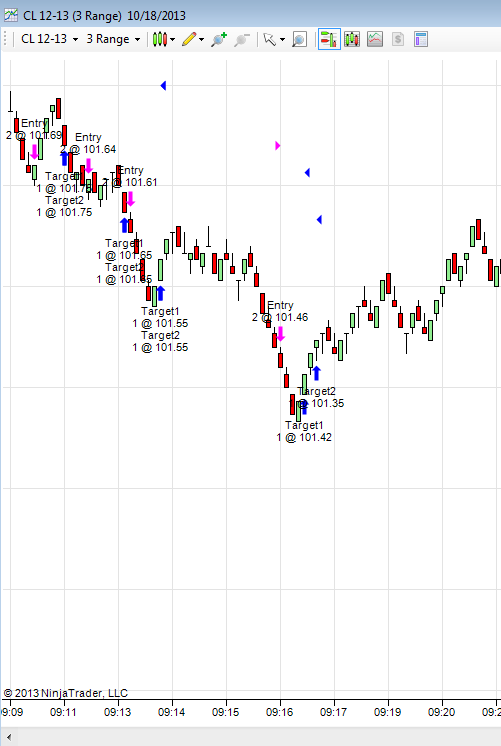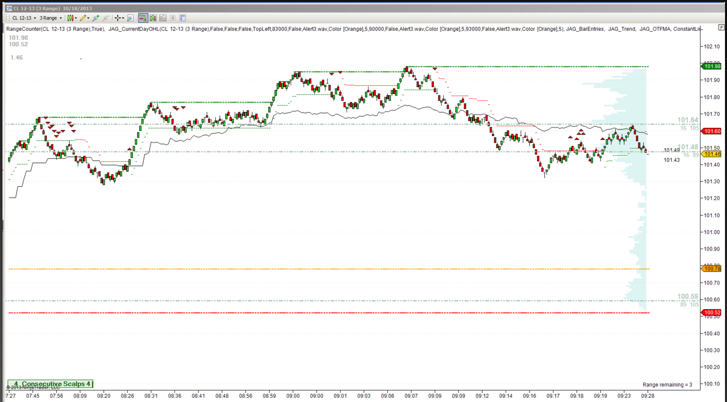 Today, heavier volume has shifted to the Dec contract on the crude, CL. However, my 3 range chart looks different from my partner's chart. After we both did "Reload All Historical Data", we synced up. Later I realized my 3 range was out of sync with my 7 range so I did "Reload All Historical Data" and now my charts are synced but looks different from my partner. Please see attachments of screen shots taken around 9:30. Notice on the second chart, the low is 101.5, but you don't see this on the first chart.