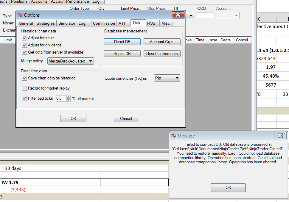 However, when I attempted to Reset or Repair the DB (under Options), the following error message appeared (see attached).