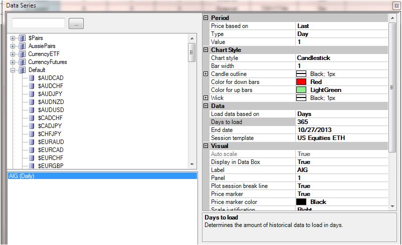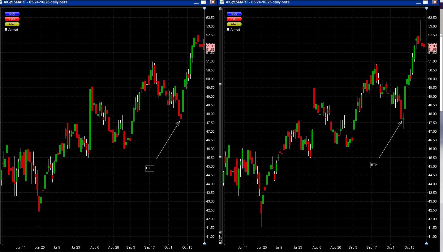 Even when selecting ETH template, I till could not get data outside of regular trading hours. I attached screen shots of ticker AIG to illustrate the problem. I am using IB as broker.