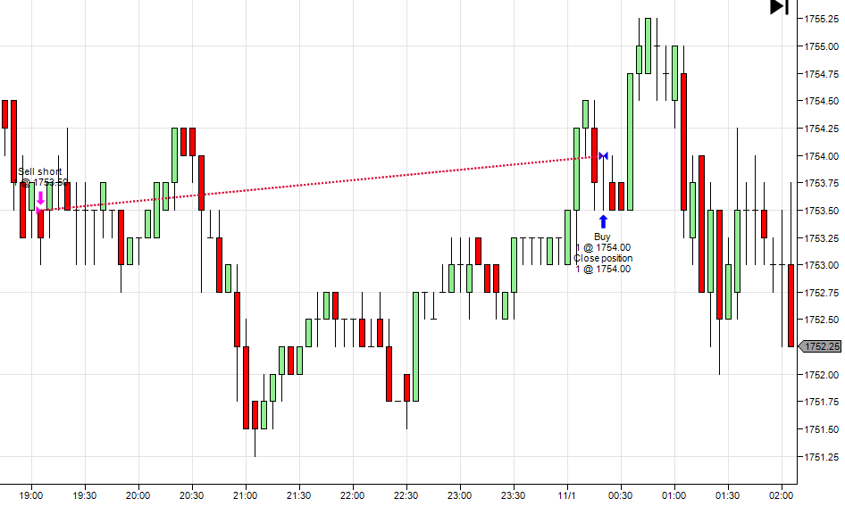 - I using teh ES 5min chart and target1=4, target2=4, target3=4, I would expect the Sell order of 19:05 to have a traget of 1pt, which is achieved at 20:55, but the instead the order goes all the way up and exit at 1754.0, which is not the stop (12t its 1756.5).